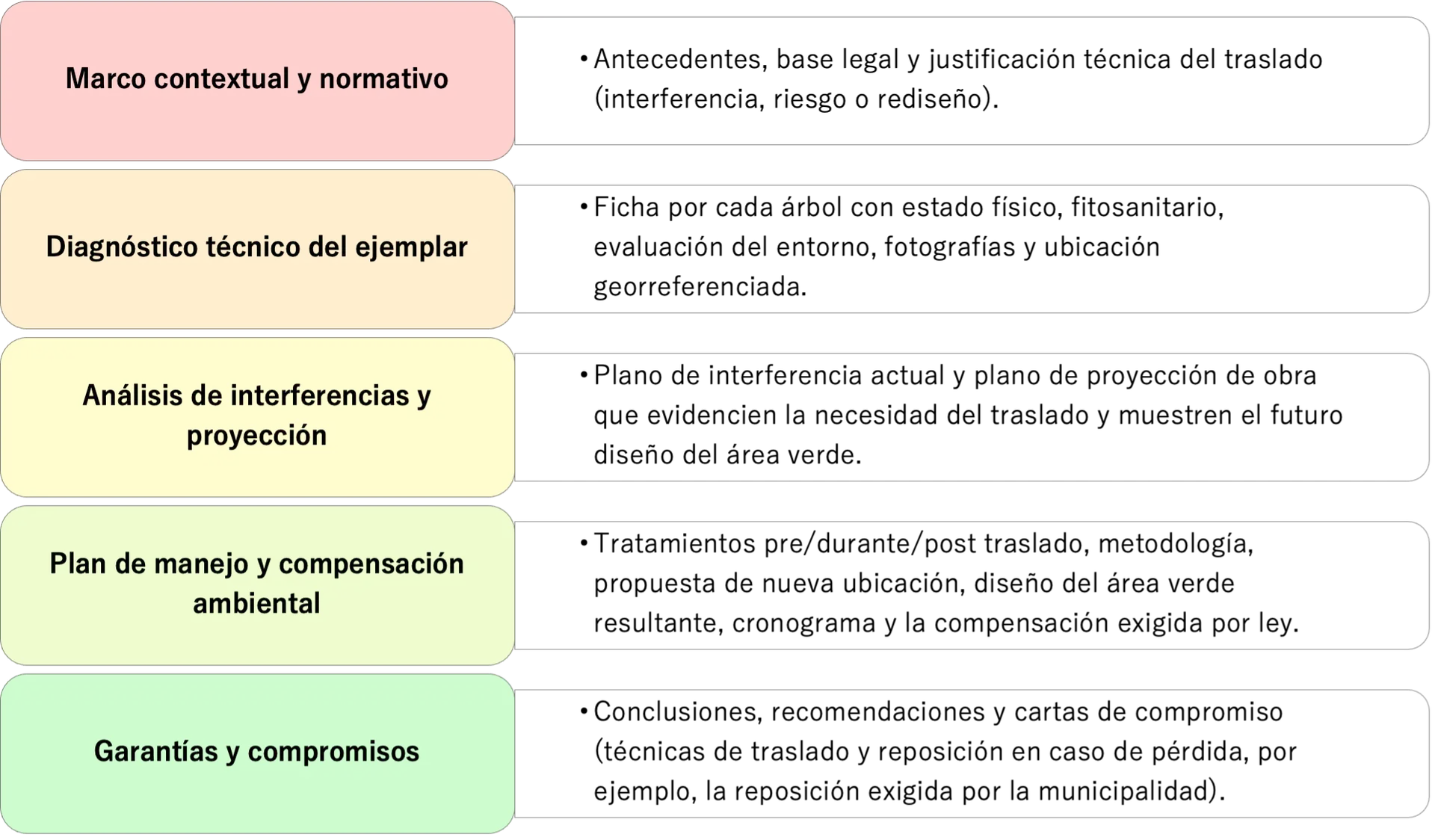 El expediente técnico es el documento fundamental para solicitar la autorización para traslado de árboles. Más que un requisito, es la garantía profesional de que el trasplante de árboles se realizará con criterios técnicos y ambientales. Para facilitar la comprensión, estos contenidos se agrupan en cinco bloques:
