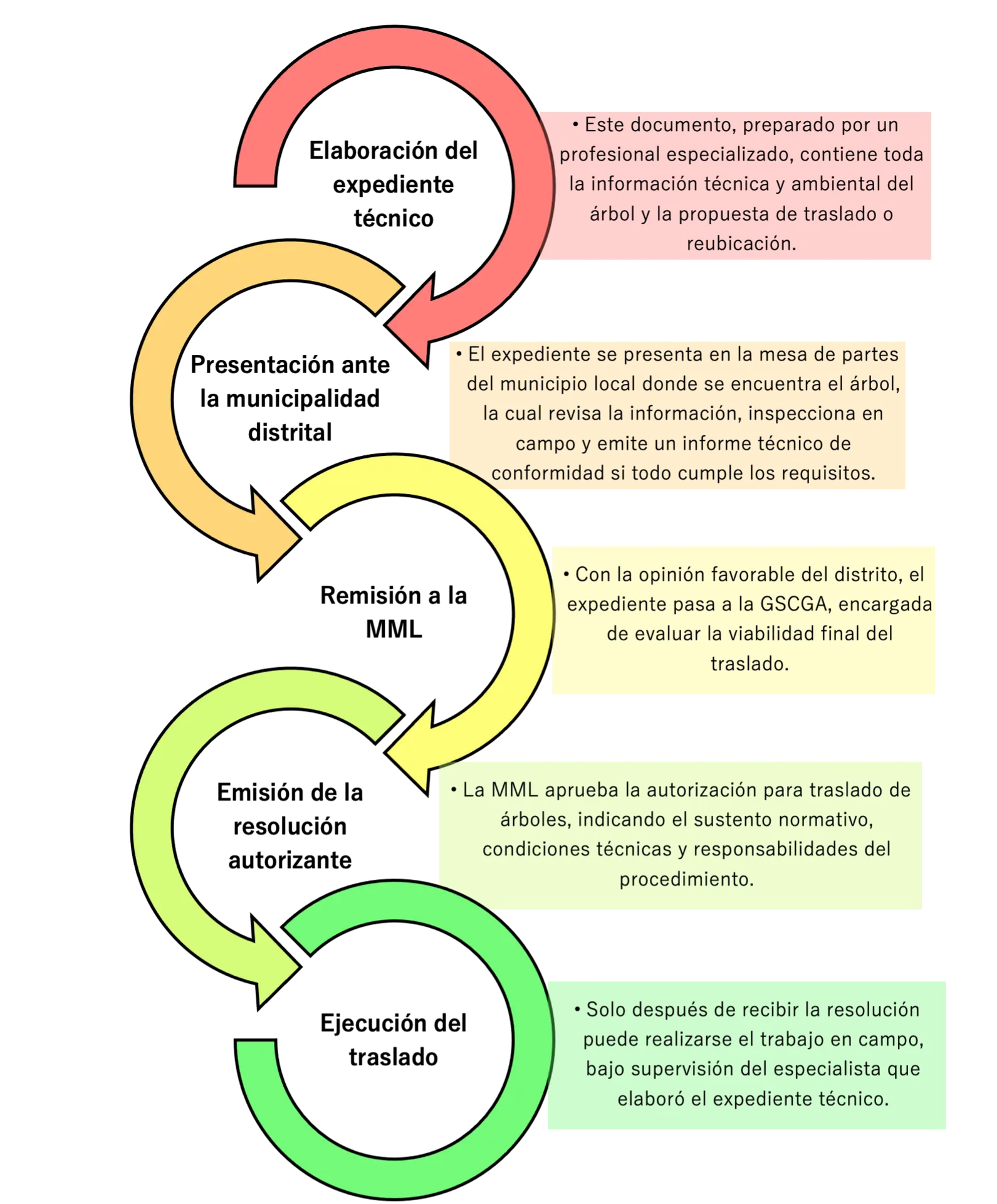 El procedimiento está regulado por la Ordenanza N° 1852, cuyo artículo 27 establece que la reubicación de árboles solo procede tras evaluar su factibilidad técnica y explorar alternativas (poda, ajuste de diseño). La norma obliga a seguir el Manual de Áreas Verdes y Arboricultura Urbana y a garantizar la compensación del área verde afectada.